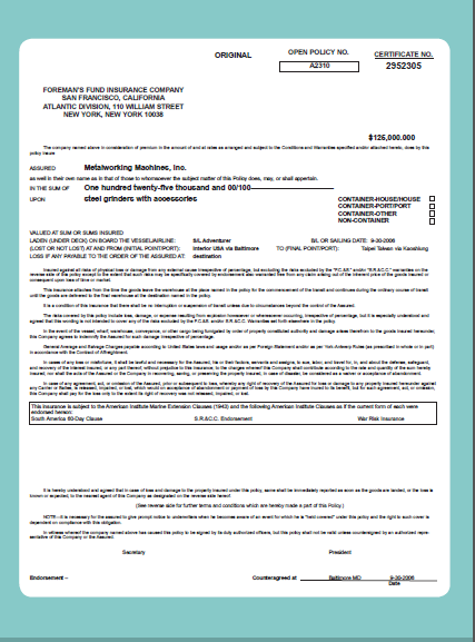 Insurance Certificate Cargo