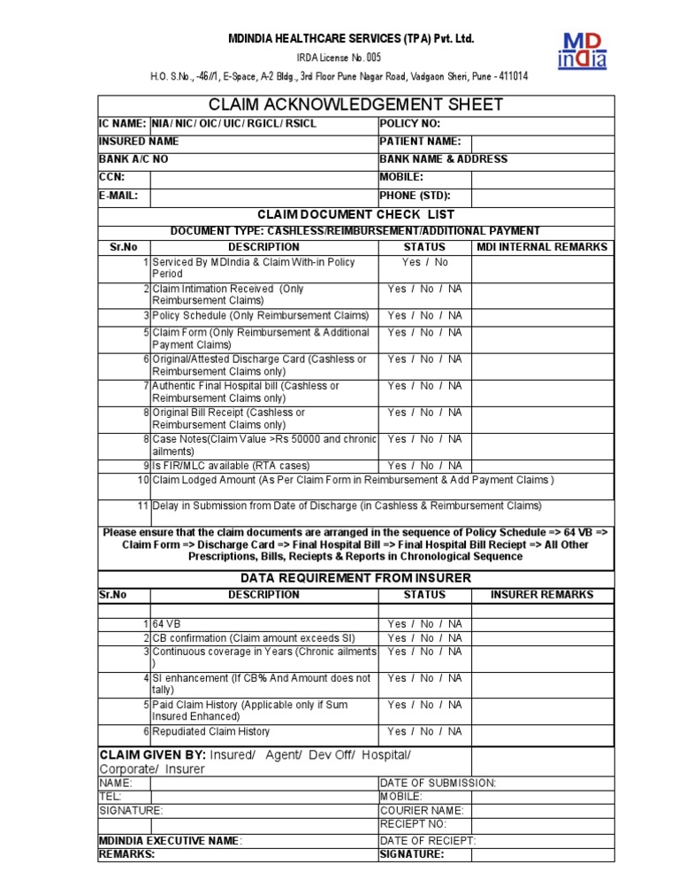 Claim Checklist For Md India Receipt Insurance