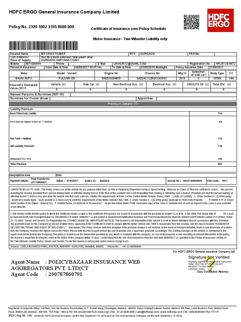 Pdf Smart Drive Two Wheeler Insurance Policy Certificate Of