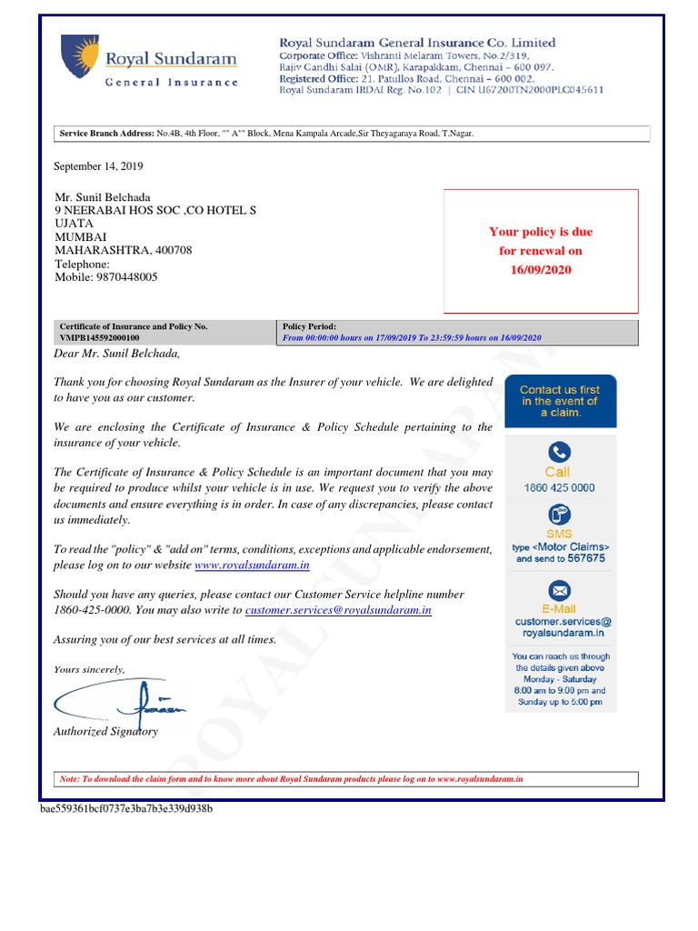 Royal Sundaram Car Insurance Renewal Copy Download