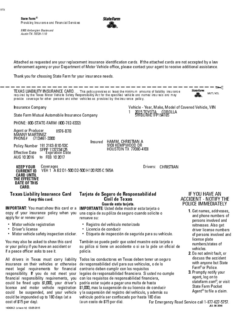 State Farm Temporary Insurance Card Fill Online Printable